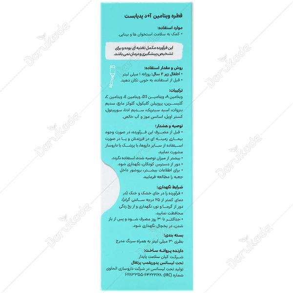 • ویتامین آ د پدیابست در حجم 30 میلی‌لیتر تولید شده است.