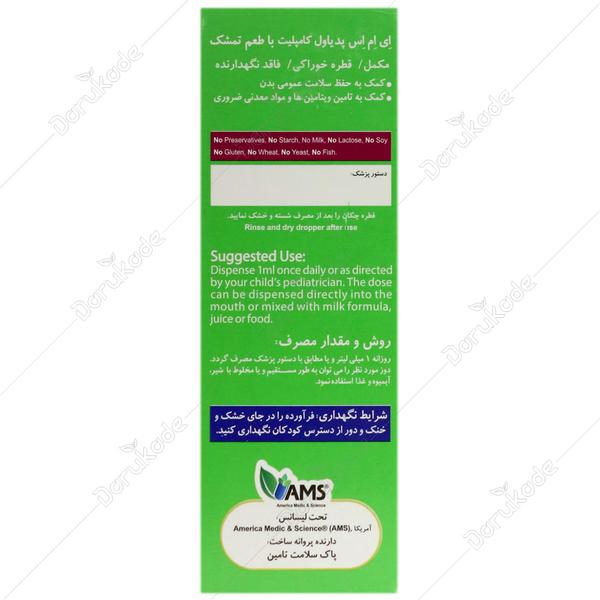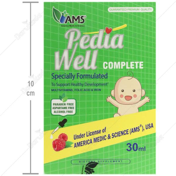 پدیاول کامپلیت حاوی مقادیر کافی از ۹ ویتامین ضروری به همراه آهن و اسید فولیک جهت تامین نیاز روزانه نوزادان و کودکان می باشد.