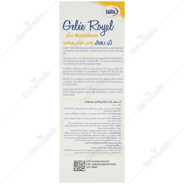 ژل رویال پلاس مولتی ویتامین یوروویتال حاوی ترکیبی متعادل از 13 نوع ویتامین ضروری به علاوه روی، عسل و رویال ژلی می باشد.